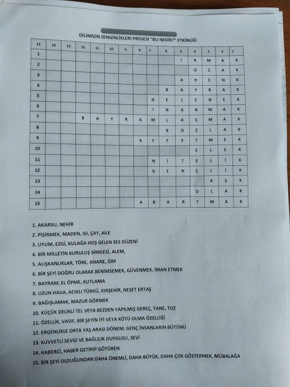Tüm sınıflarda “Bu Nedir?” etkinliği düzenledik. Bu etkinlikte; son harfi verilen varlıkların, eşyaların ve kavramların ipuçlarıyla bulunması amaçlandı. Öğrencilerden verilen ipucu yardımıyla son harfi "K" olan varlığın, eşyanın veya kavramın ismini boşluklara yazmaları istendi. Bu etkinlik, öğrencilerimizin gözlem yeteneklerini geliştirmelerine ve kelime dağarcıklarını genişletmelerine yardımcı oldu. Aynı zamanda öğrenciler arasında eğlenceli bir rekabet ortamı oluşturdu.